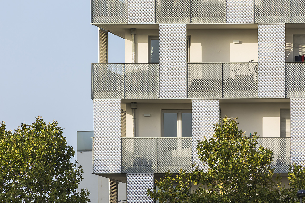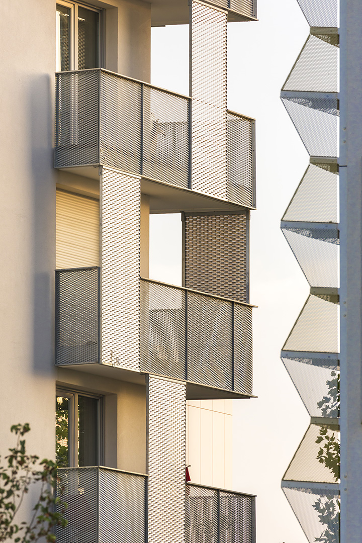 La façade est active, elle se transforme au gré des habitants. Les pleins composés de panneaux en bois clair coulissent et dévoilent les creux des terrasses suivant les heures de la journée. Chaque niveau est souligné par de fins bandeaux métalliques qui prolongent les dalles des terrasses. Ils abritent les mécanismes des panneaux coulissants qui peuvent dès lors se superposer. Le décalage des ouvertures d’un niveau à l’autre contribue à la lecture dynamique du projet. Les panneaux en inox de l’attique se retrouvent aléatoirement sur toute la façade.