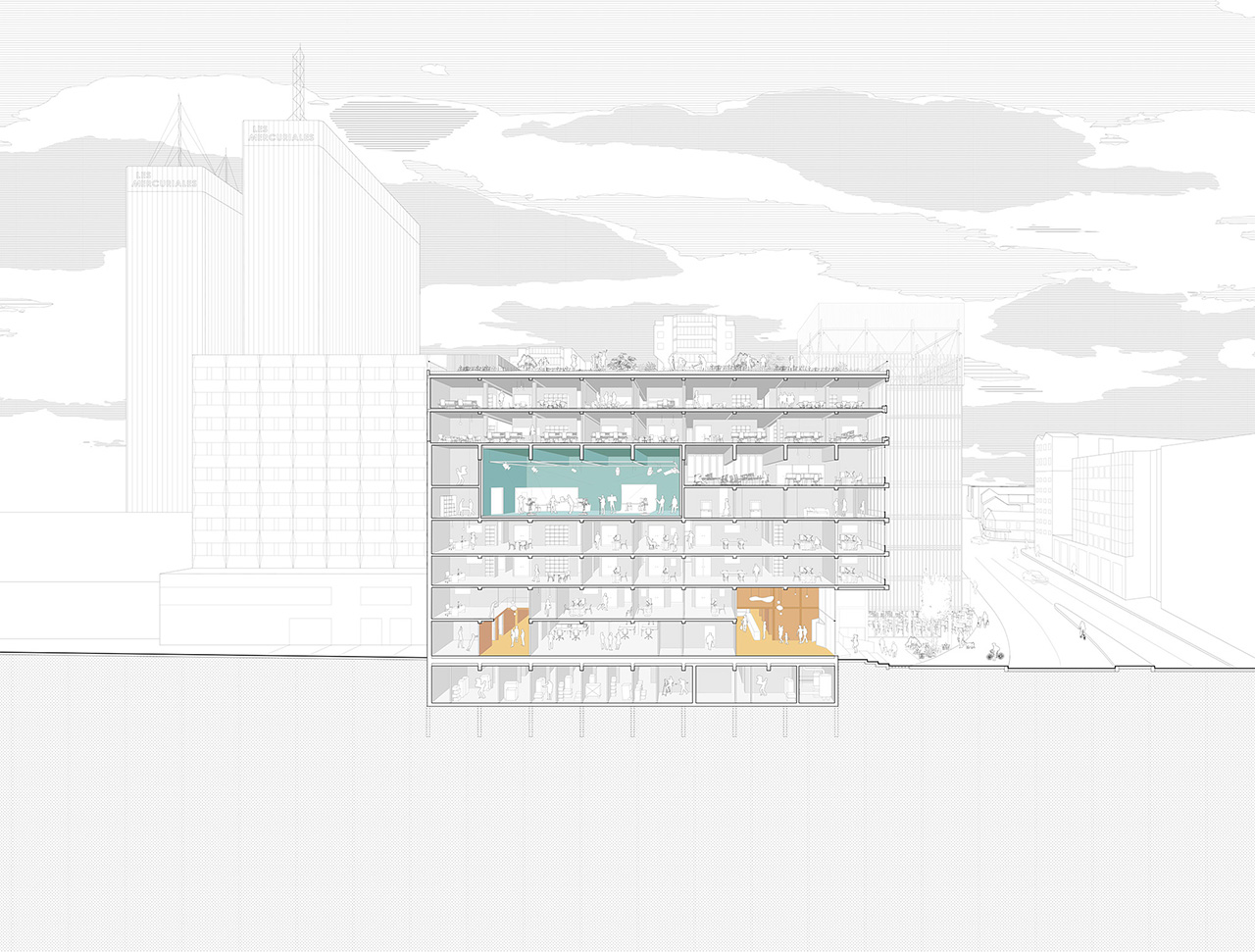 Le RDC largement ouvert sera un lieu de vie pour ceux qui y travaillent comme pour ceux qui souhaitent se rendre au futur restaurant de quartier. Il permettra d’approcher un secteur d’activité riche et enthousiasmant, inspirant pour les lieux et les habitants.