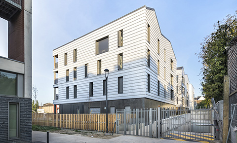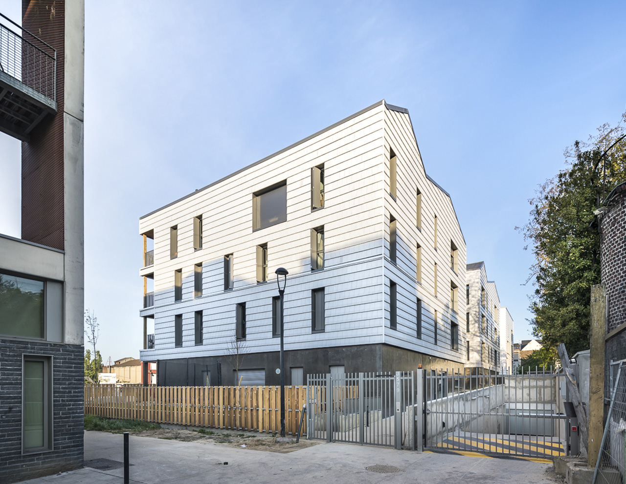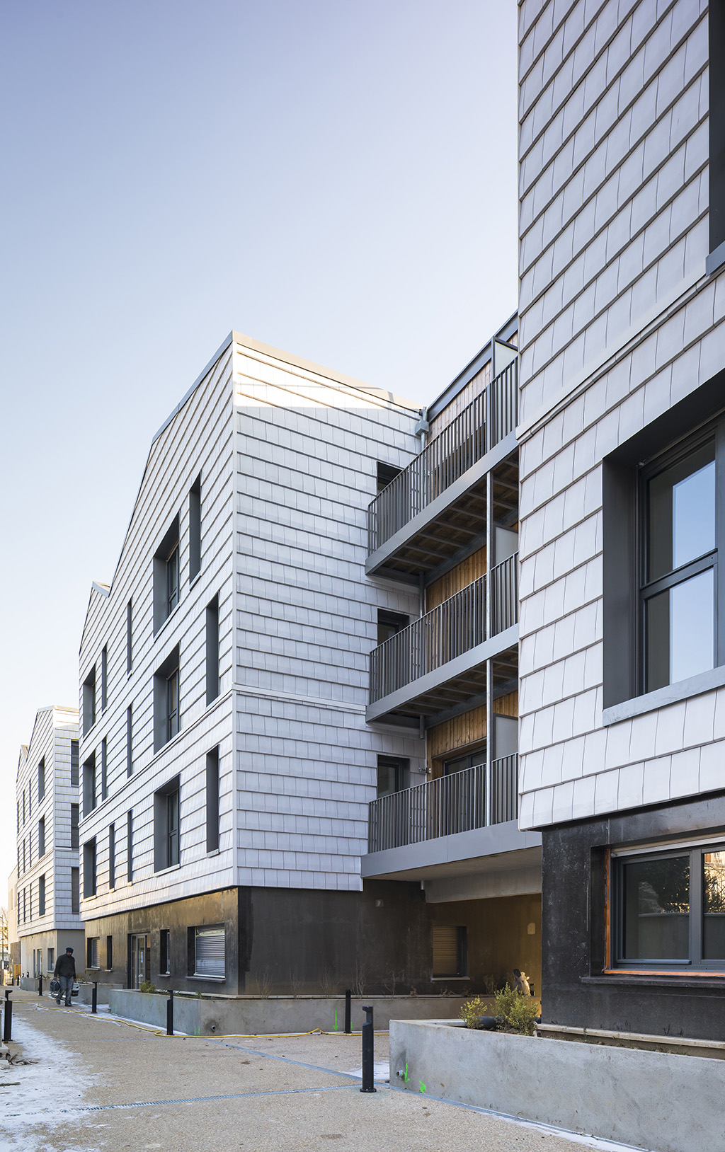 Avec ses volumes proches de l’échelle des petits immeubles du centre-ville de Pierrefitte, les logements s’intègrent parfaitement au paysage urbain. Des toitures à deux pans de zinc clair qui évoquent des maisons coiffent les volumes simples revêtus d’ardoise naturelle.