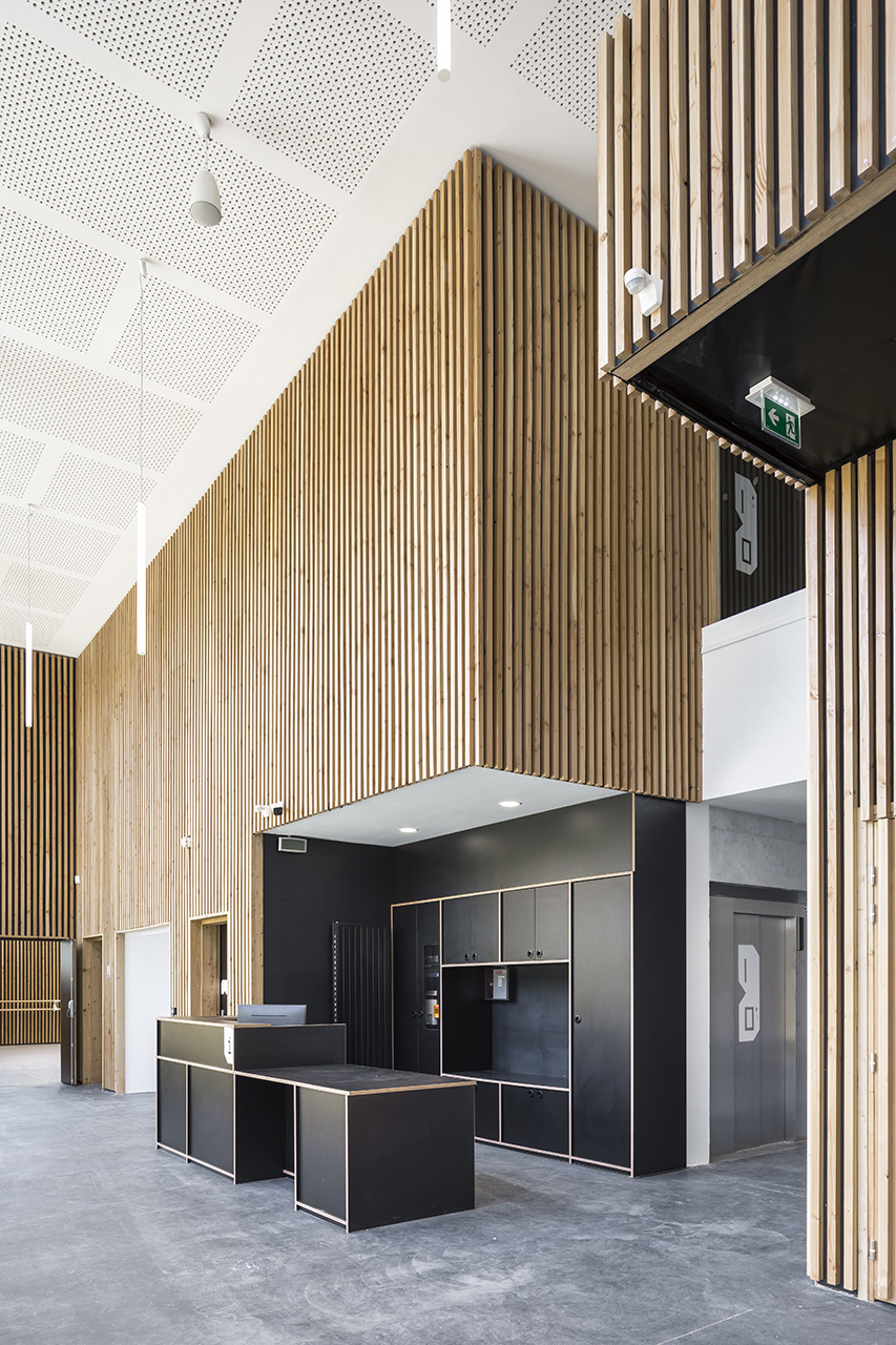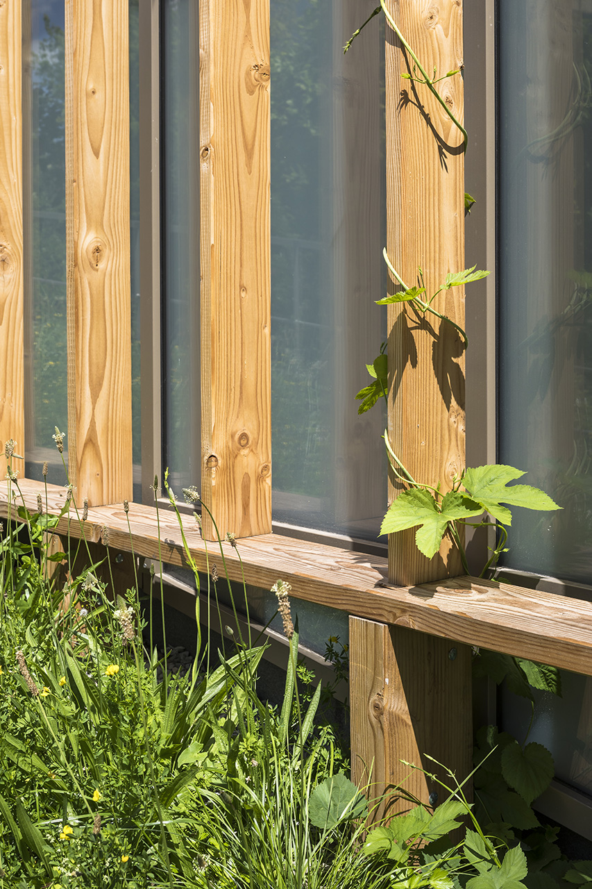 Sa structure d’acier répond aux contraintes de charges grâce à une trame resserrée, apparente dans l’aménagement du gymnase et conférant son dynamisme au volume. Au sommet de la colline, émerge le signal urbain de la ferme : une petite maison de bois et les serres de production.