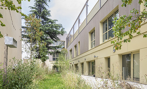 Situé en limite sud de la zone du Village Olympique et Paralympique, le groupe scolaire se positionne comme articulation entre l’existant et le nouveau quartier de Saint-Ouen. Architecture et espaces paysagers dialoguent dans ce riche contexte urbain tourné vers le parc Ampère, centralité affirmée de ce renouvellement urbain. Le projet de paysage s’inscrit comme une large et abondante continuité végétale. D’abord vertical, ce corridor «vert» communique entre les terrasses depuis le rez-de-chaussée, puis horizontalement comme une extension arborée du parc. En accord avec les préconisations du plan directeur de la ZAC, la stratégie végétale est ainsi résolument orientée vers les problématiques climatiques et environnementales d’aujourd’hui et de demain.